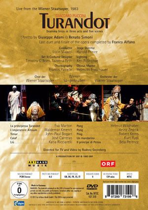 From the Vienna State Opera Arthaus presents a timeless document of great opera. Lorin Maazel and a dream cast of distinguished singers, among them the young Eva Marton and José Carreras in his mid-thirties, perform a celebrated staging of Puccini’s Turandot. Puccini’s last opera tells the story of the battle of the sexes against an exotic backdrop. The work tells the story of the beguilingly beautiful and cold yet seductive Chinese princess, Turandot.