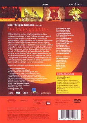 William Christie and Les Arts Florissants propel this exuberant production of Jean-Philippe Rameau’s second opera to great heights. Andrei Serban’s extravagant, highly baroque staging presents the four exotic love stories in a fantastic operatic spectacle. In Le Turc généreux Osman sets free his captive, Emilie, whom he loves, so that she may be reunited with her former lover, Valère; Les Incas de Perou is all about the rivalry of the Inca Huascar and the Spaniard Don Carlos, both in pursuit of Princess Phani; Les Fleurs offers a Persian love intrigue, as the Sultana Fatima tries to detect whether her husband Tacmas has his eye on the lovely Atalide; and Les Sauvages takes us to North America, where a Spaniard and a Frenchman compete for the love of Zima, daughter of a native chief, who prefers one of her own people.